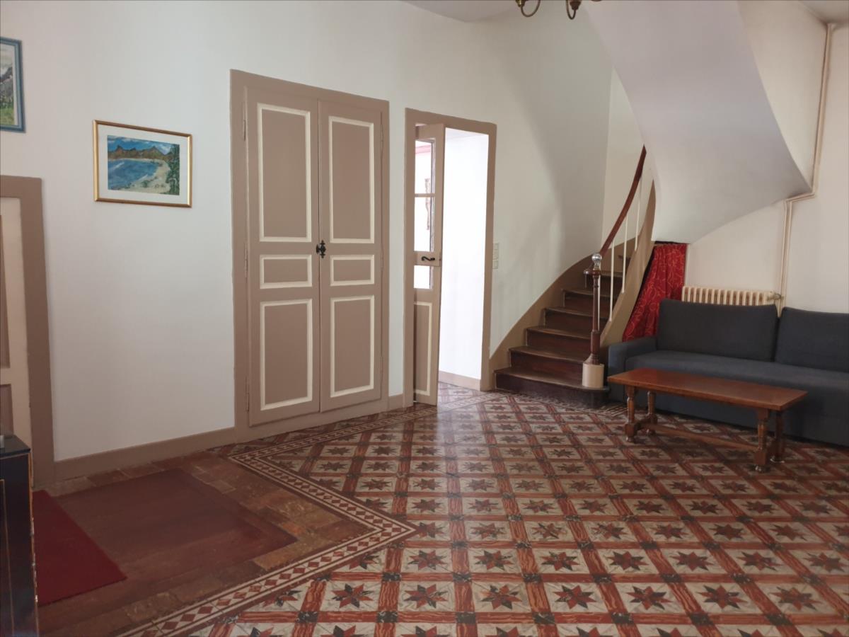 mitoyenne sur 2 côtés, dans l'angle d'une rue, constr. en pierres, couv. en tuiles de pays :